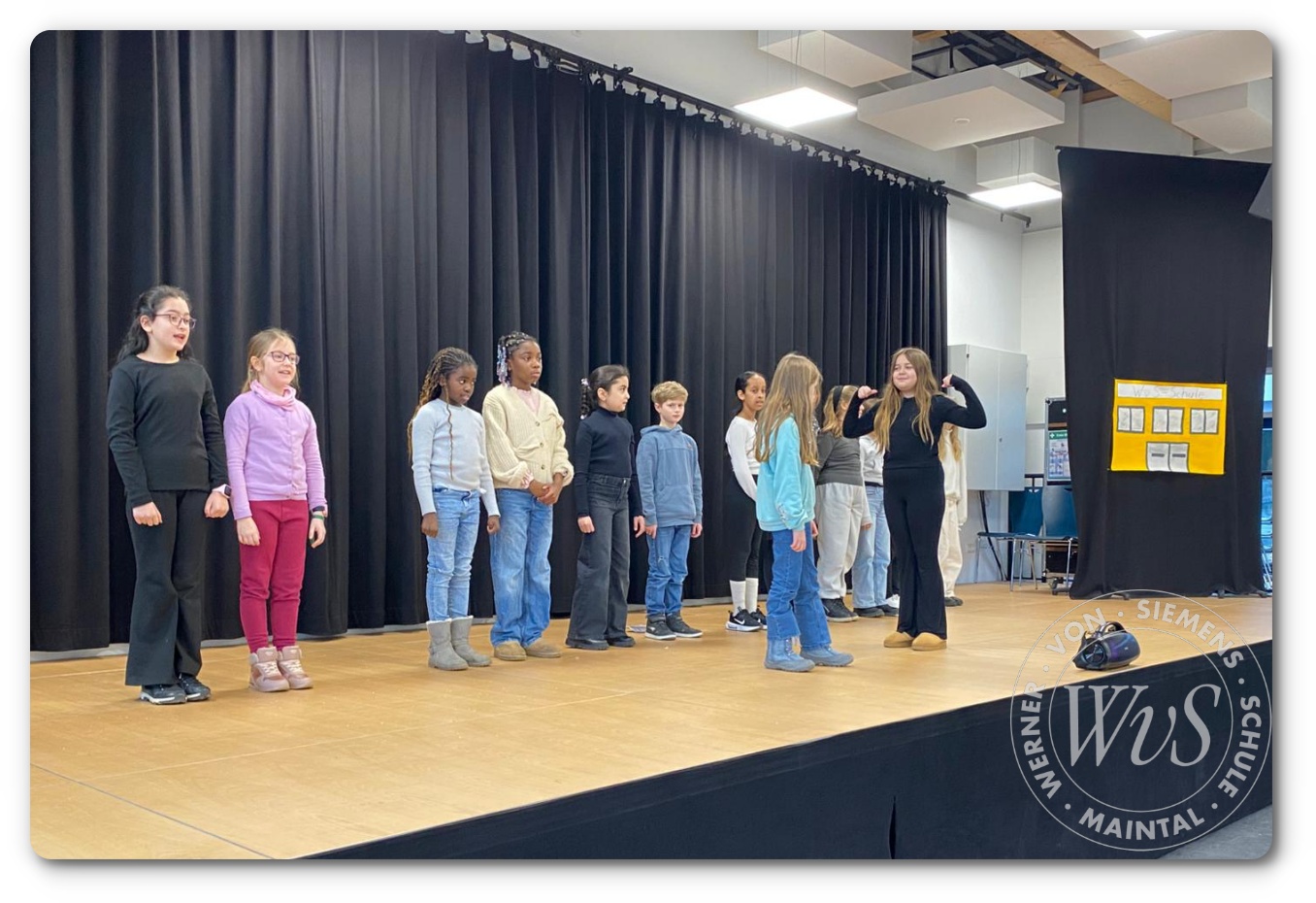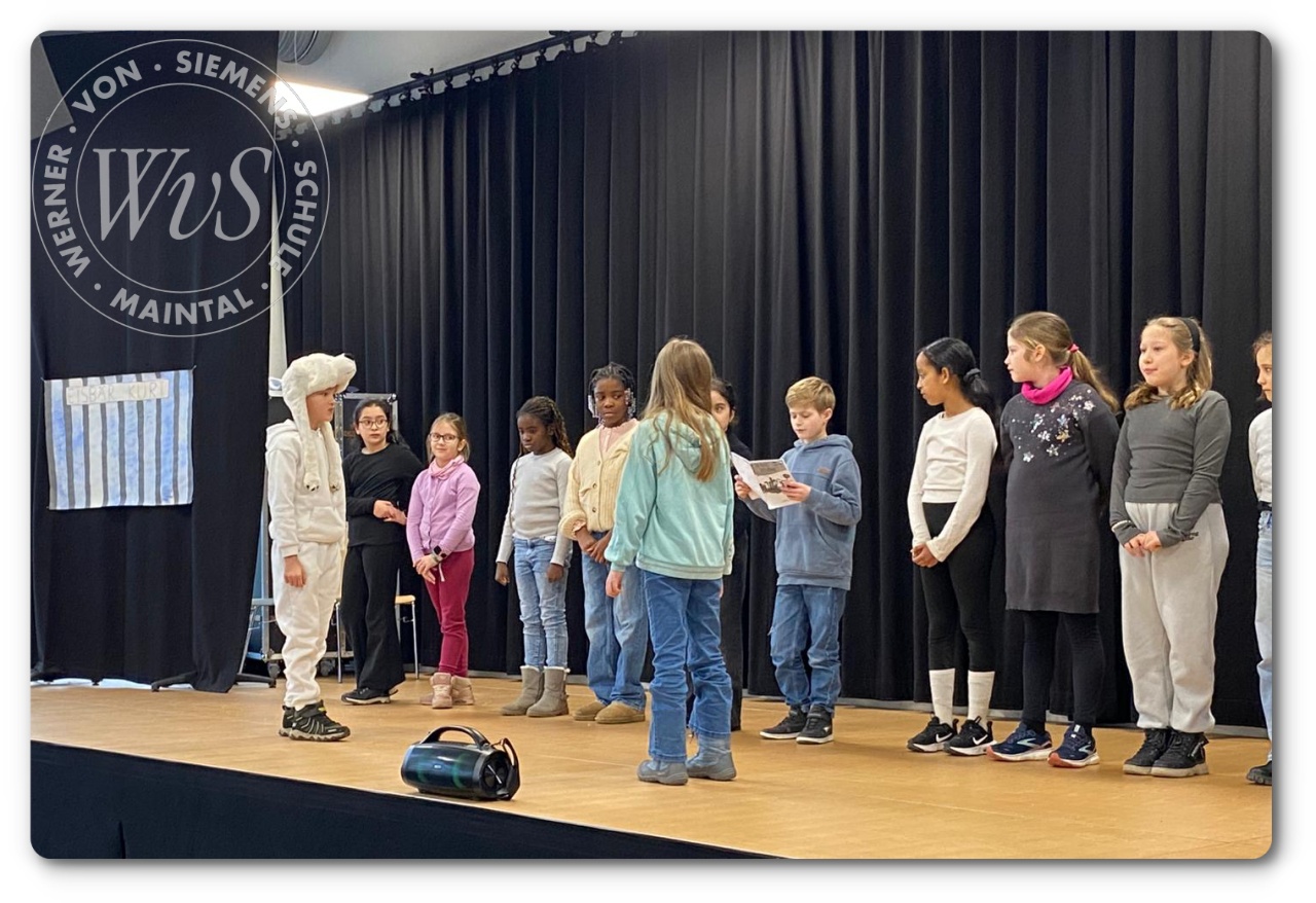 Unter der Leitung von Maria Siebner studierten Schülerinnen und Schüler der dritten und vierten Klassen ein halbes Jahr lang Lieder und Dialoge für ein etwa zwanzigminütiges Musical-Theater ein. Der Einsatz der Kinder hat sich gelohnt, denn trotz Erkrankung der AG-Leiterin beherrschten sie das Stück so gut, dass die Aufführung mit der stellvertretenden Lehrkraft Fanny Laroque reibungslos „über die Bühne“ ging. Die kleinen und großen Zuschauer waren begeistert.