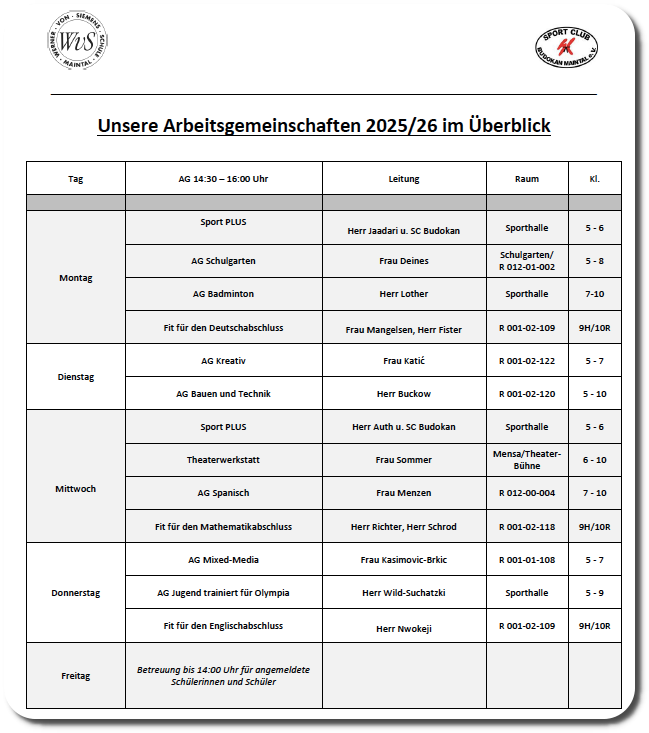 Bis spätestens 29.09.2025 muss man sich verbindlich über die AG-Leitung angemeldet haben, wenn man an einer AG teilnehmen möchte. Fehlzeiten müssen bei der AG-Leitung innerhalb von fünf Unterrichtstagen schriftlich von den Eltern entschuldigt werden. Die Teilnahme an der AG wird im Zeugnis vermerkt.