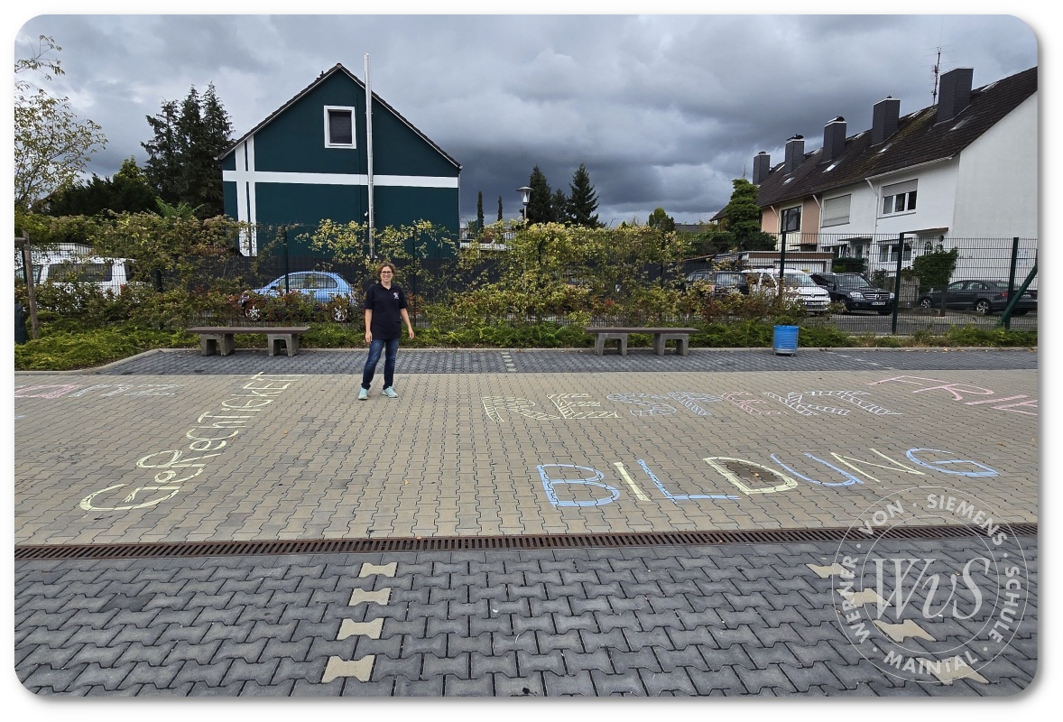 Im Zentrum der Aktion standen die Sichtbarmachung und Reflexion zentraler demokratischer Werte wie Freiheit, Respekt, Gerechtigkeit, Frieden, Toleranz und Bildung. Diese Begriffe bildeten die Basis und sollten nach außen und innen hin sichtbar sein - und wurden deshalb mit bunter Straßenmalkreide auf dem Schulhof Ost aufgemalt.